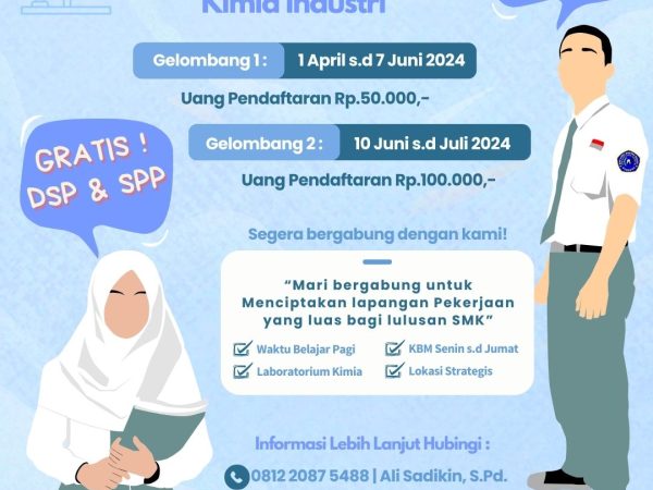 SMK KIMIA DHARMA BHAKTI BANDUNG telah berdiri sejak 1972 berkomitmen Membangun Generasi Cerdas yang Berkarakter, Religius, Nasionalis, Berwawasan Global dan Peduli Lingkungan.